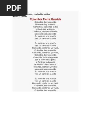 Colombia tierra querida himno de fe y armonia cantemos, cantemos todos himno de paz y alegria vivemos siempre vivemos a nuestra patria querida tu suelo es una oración y es un canto de la vida (bis) colombia te hiciste grande con el furor de tu gloria america toda canta la floracion de tu historia cantemos, cantemos todos a mi colombia querida tu suelo es una oración y es un canto que da vida. Vivemos, siempre vivemos a nuestra. Disfruta del vídeo colombia tierra querida del artista juan carlos coronel.más tropical de codiscos aquí: Tu suelo es una oracion y es un canto que da vida (bis) cantando, yo vivire. Letra de colombia tierra querida de orquesta lucho bermúdez.